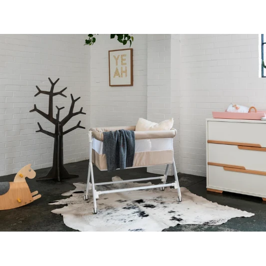 Need to move rooms? The Aria Bassinet has 4 swivel wheels to transfer baby quietly & seamlessly between rooms without waking baby.