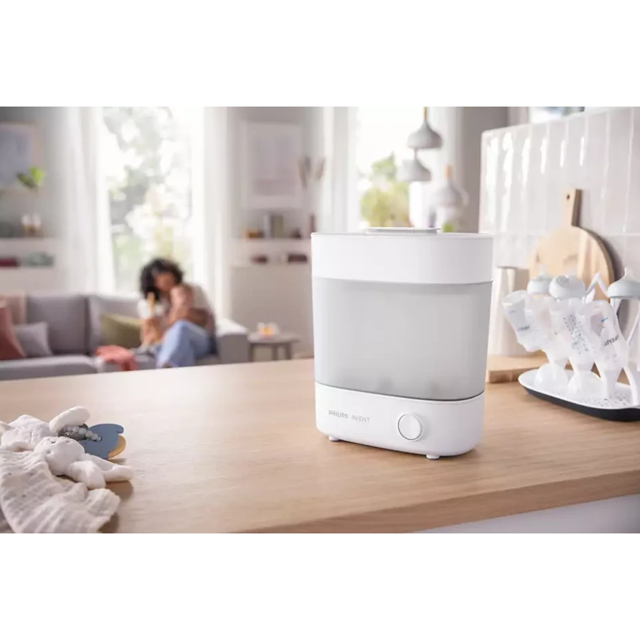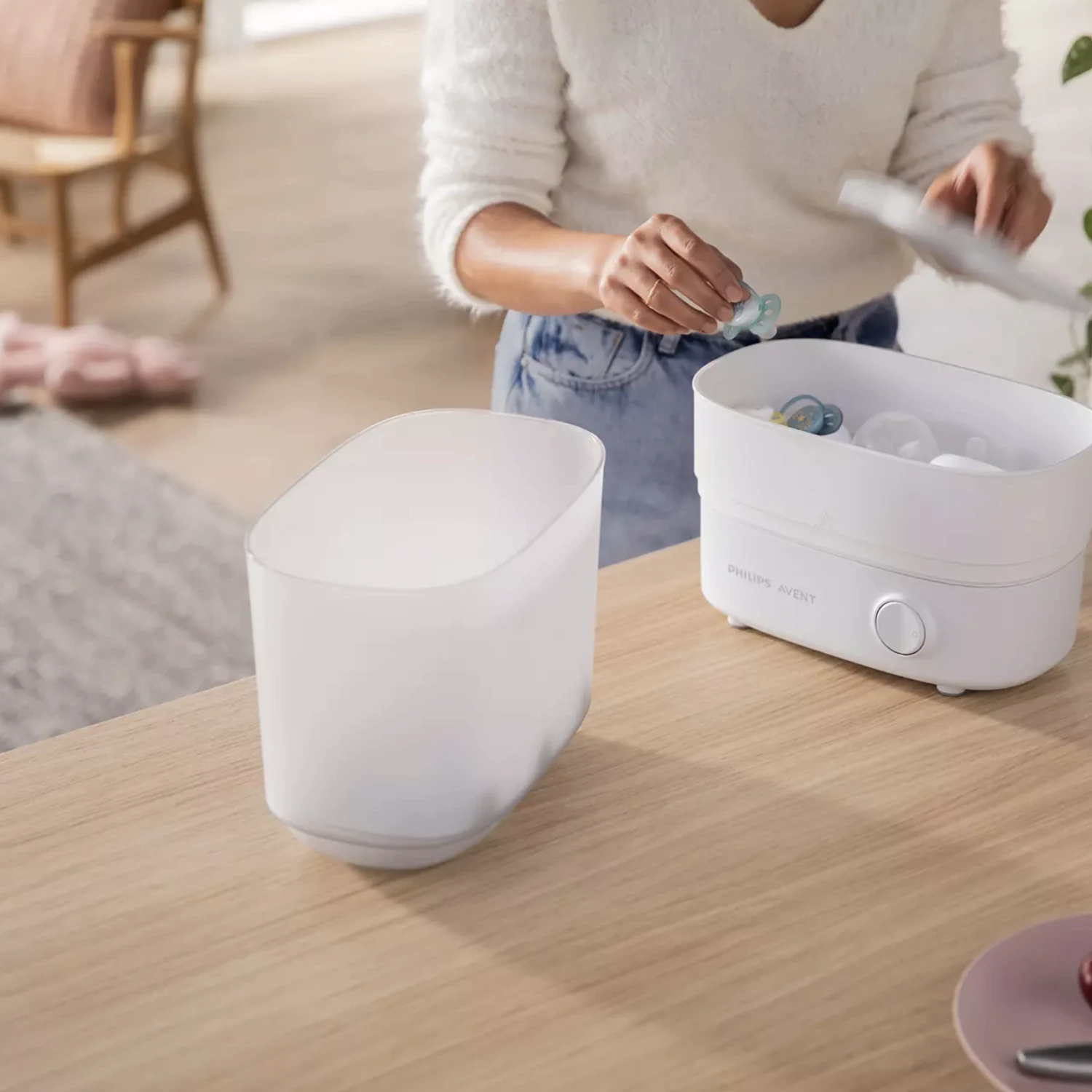 Sterilise up to six feeding bottles with accessories in just 10 minutes. The slim but roomy Bottle Steriliser Advanced is fast and efficient, killing 99.9% of germs* for peace of mind at every feed.
