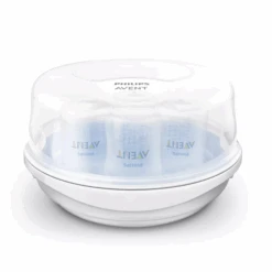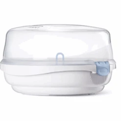 The Philips AVENT Microwave Steam Steriliser (also spelt sterilizer) has a lightweight and compact design, which makes it ideal for sterilizing feeding bottles in and out of the home. Contents remain sterile for up to 24 hours if the lid is unopened.