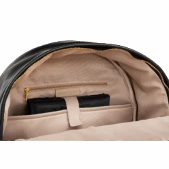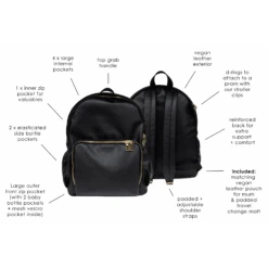 Made from premium black vegan leather, with a beige interior (designed for better visibility) the super spacious, yet sleek design is packed with functional features and ticks all the essential baby bag boxes (plus many more)!