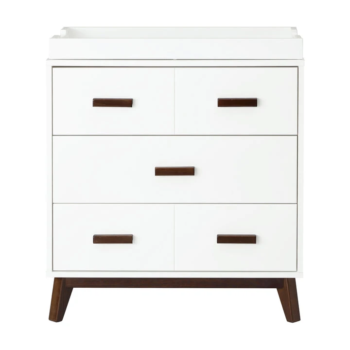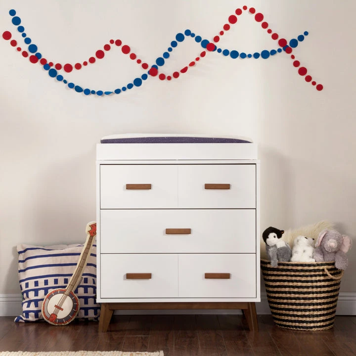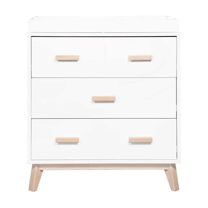 The Scoot 3-drawer Changer Dresser is the definition of mid-century modern style. The perfect accompaniment to your Scoot 3-in-1 Cot with matching tapered feet and two-toned or solid color detailing. With three smooth-glide drawers and an included removable changing tray, this compact unit provides a range of practical storage possibilities to suit all of your nursery needs.