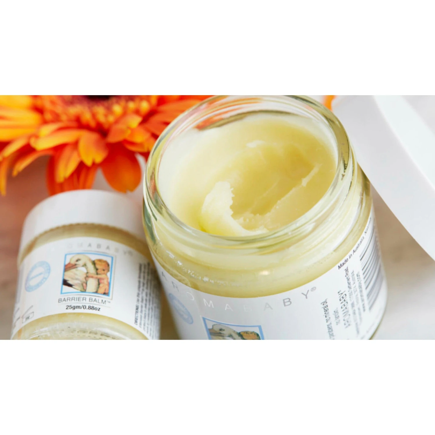 This unique, natural product has been soothing skin for 25 years. The only balm of its kind, developed to help care for nappy rash, cradle cap and dry skin, AROMABABY Barrier Balm™ melts on contact with the skin and offers a natural and organic solution where zinc creams may have failed. Carefully chosen natural oils work together to moisturise whilst providing a light barrier to help protect the skin. Enriched with organic evening primrose, vitamin e and calendula oils, this effective Balm may be used around the nappy area, massaged onto dry skin including skin affected by eczema, is suitable for use on the scalp where flaky skin is a concern or may be used as an effective solution to suit all of your family’s sensitive skin needs. Ideal for sunburn, windburn, chafing, dry lips and cracked nipples during breastfeeding.