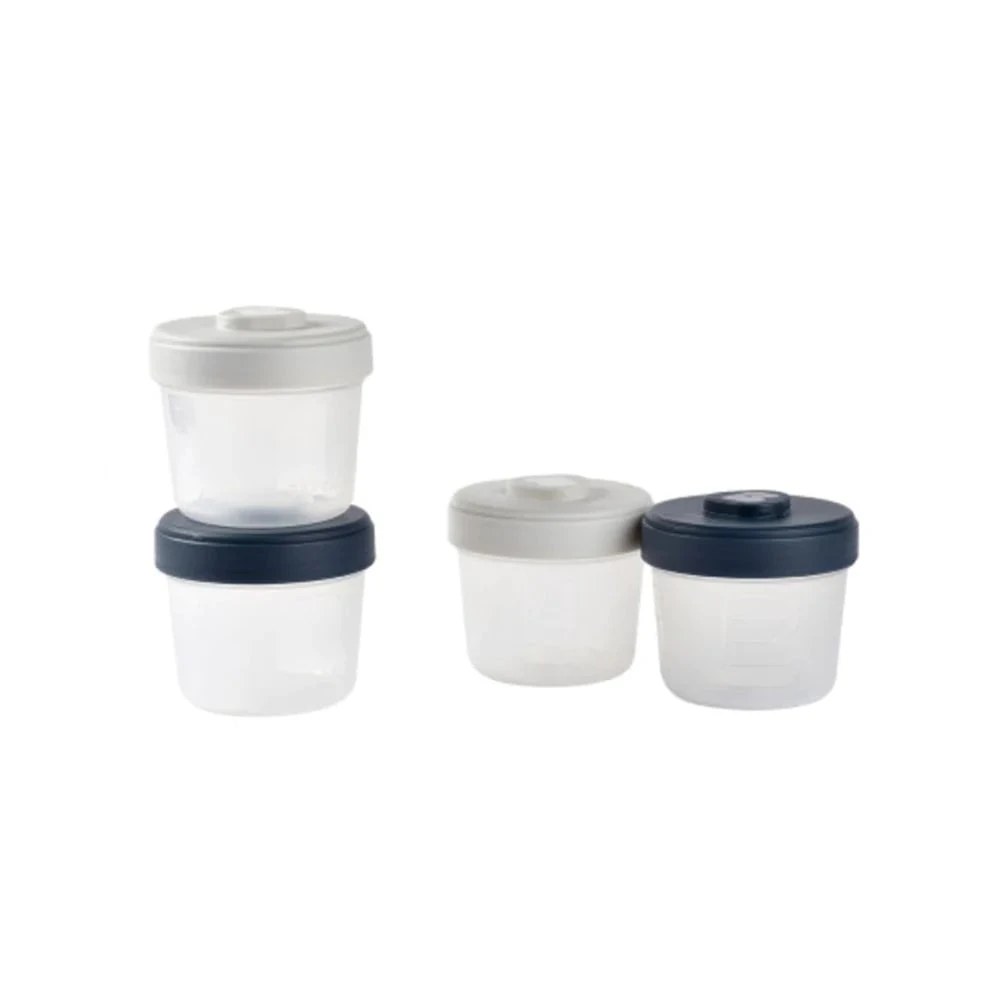 Set of 4 Béaba baby food storage jars with black and grey lids, for storing homemade purées and compotes. These easy clip portions come in a pack of 4 portions with 2 x 90ml and 2 x 150ml containers. Their stackable, clippable design makes it easy to store both in your pantry and your freezer!