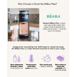 The Milkeo Plus is the new generation of automatic bottle makers with a sleek design. Designed to simplify and speed up bottle preparation, this automatic device doses, heats, and dispenses directly into the bottle in less than 20 seconds. This speed and efficiency save parents valuable time, especially during restless nights.