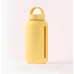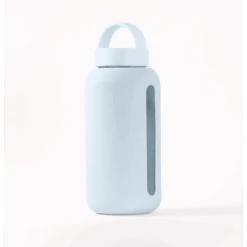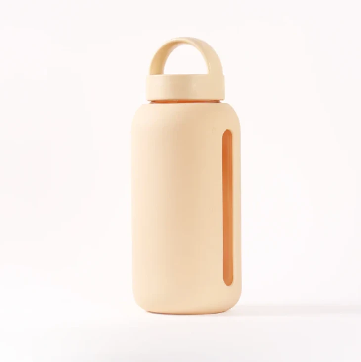A simple glass water bottle with hydration tracking designed to help you meet your daily recommended water needs.