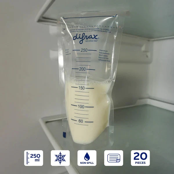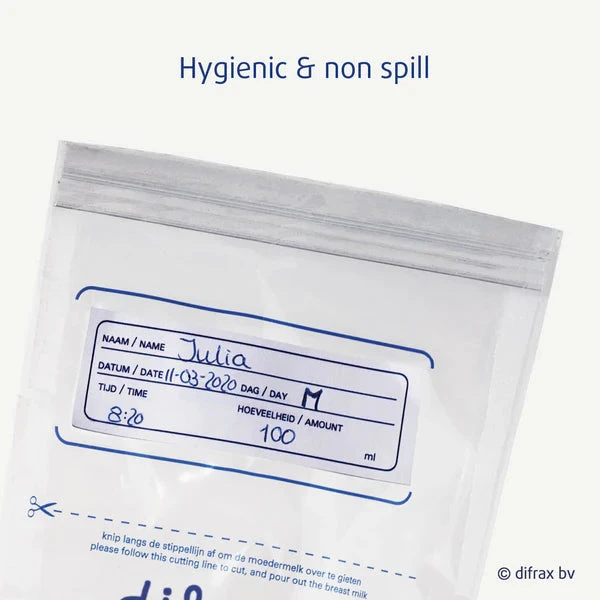 Using the Difrax breast milk storage bags you can easily and hygienically store expressed breast milk in the freezer or refridgerator. The contents and date of expressing the milk can be written on the label of the freezer bags. 20 pieces.