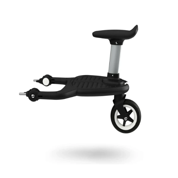The Bugaboo comfort wheeled board is ideal for parents going out with a baby and toddler. It was designed to make your pram more versatile in just a few clicks and will allow you to go for long walks with your children. Your toddler will be happy to walk around or just sit and rest when feeling tired. The installation is easy—when combined with a matching Bugaboo adapter, it can be attached to any Bugaboo pram. The flexible board position—slightly to the left or right from the handlebar centre—creates extra walking space for you; and, when not in use, you can easily click it into an upright position or detach it from your stroller.