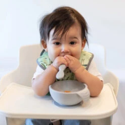 Introduce baby to the world of self-feeding and utensils with this set of starter spoons. Made from 100% food-safe silicone that is gentle on gums, Silicone Dipping Spoons are double-ended to grow with baby—one side for dipping into purees, the other for scooping. Silicone Dipping Spoons are the ideal size for baby to begin the motions of self-feeding while under the supervision of an adult. With three spoons in a set, there are enough for both parent and baby to have a spoon in hand, avoiding any power struggles with independent eaters. Spoons can be used with the Bumkins Silicone First Feeding Set or separately. Easy to clean by hand and dishwasher safe.