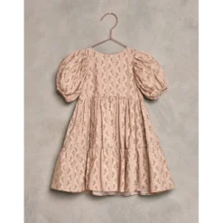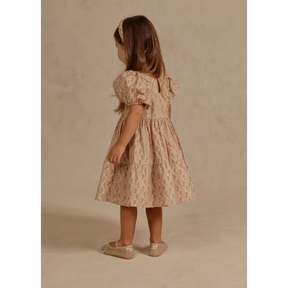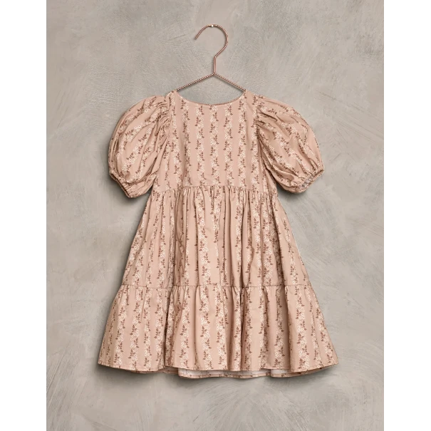 This dreamy, midi-length dress features a layered tiered skirt, full puffed sleeves, and a delicate summary-back closure, perfect for your special occasions!