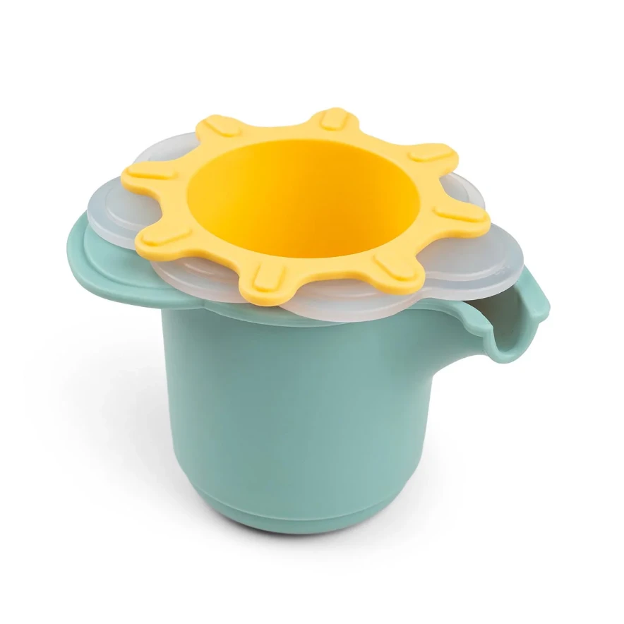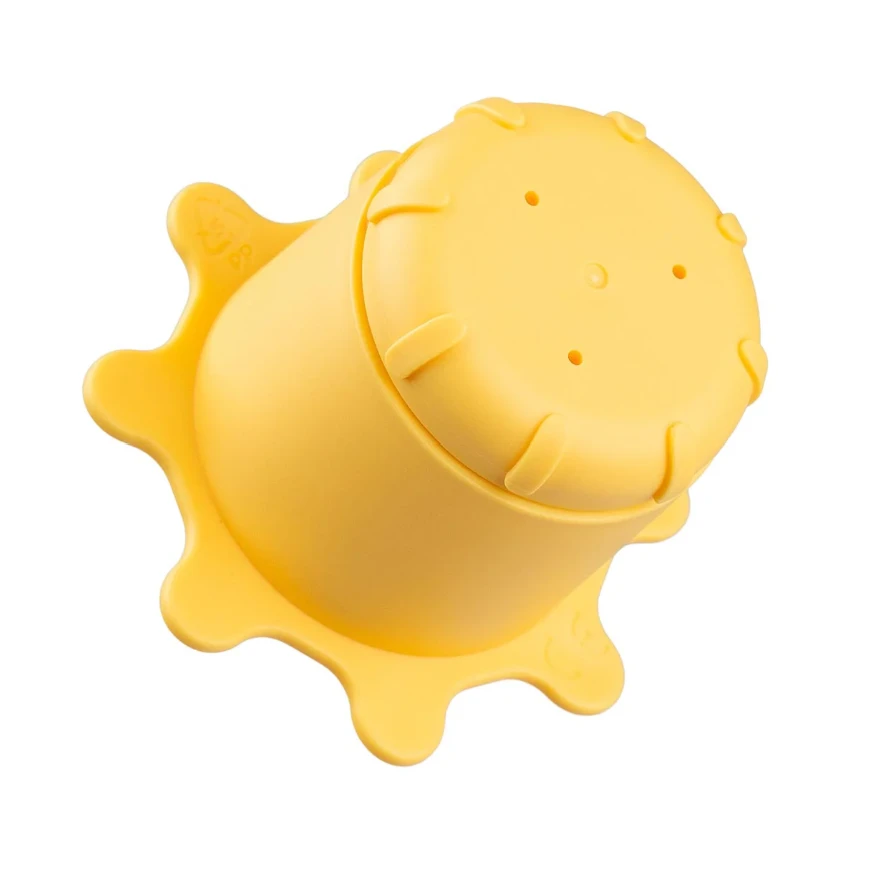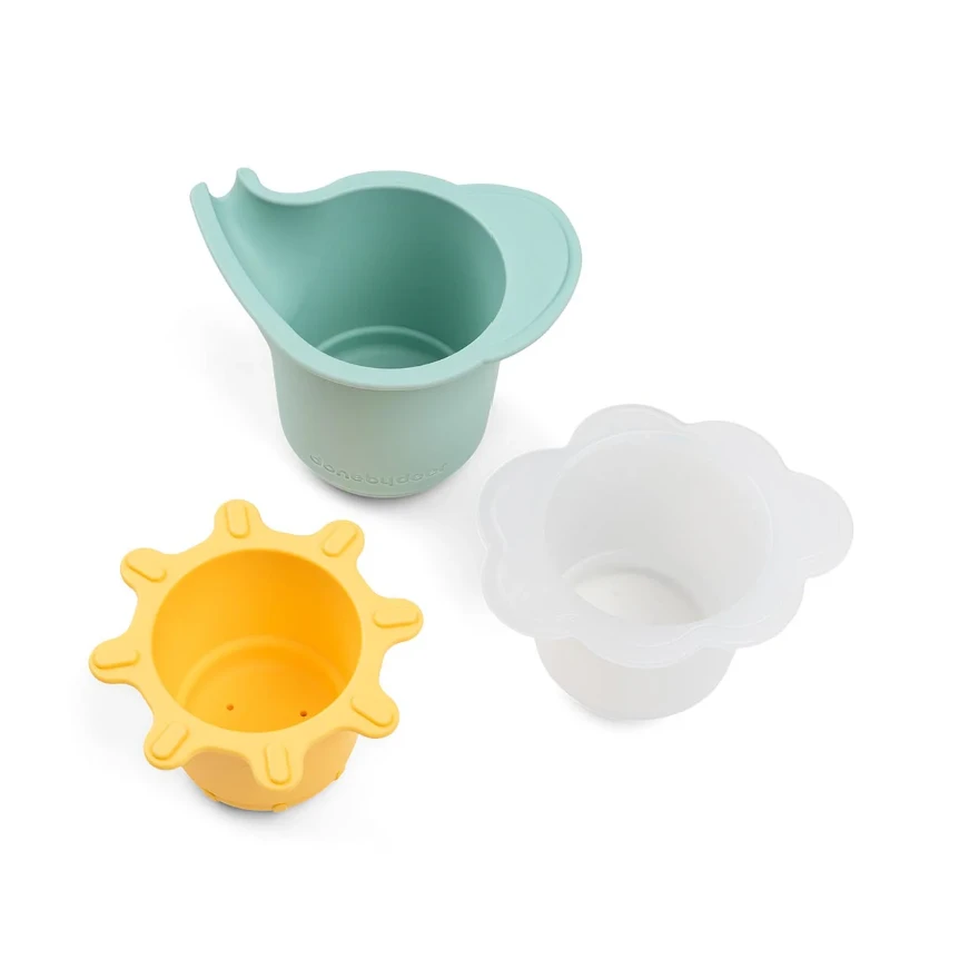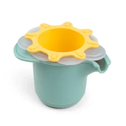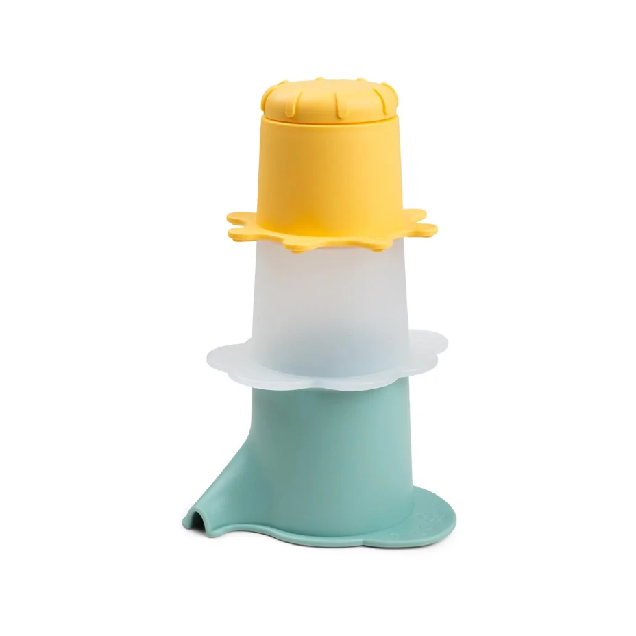 - Contains a blue Elphee shaped cup, a semi-transparent white cloud-shaped cup with holes in the bottom, and a yellow sun-shaped cup with an open and close feature
