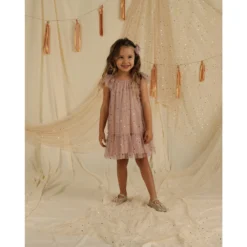 New Edie Dress is perfect for dress up or any special occasion, with flutter sleeves and shimmery fabric.