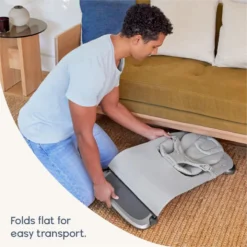 The Evolve Bouncer offers breathable mesh fabric for maximum airflow. This portable bouncer features natural rocking technology—no plugs, batteries, or switches needed. Lightweight design allows movement from room to room with ease, folds flat for easy storage.