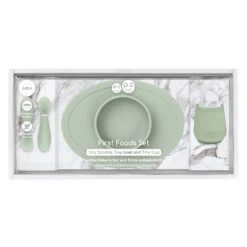 The EZPZ Tiny First Foods Set is designed to fit on the tiniest of highchair trays, including the Stokke Tripp Trapp and Boon Flair trays.