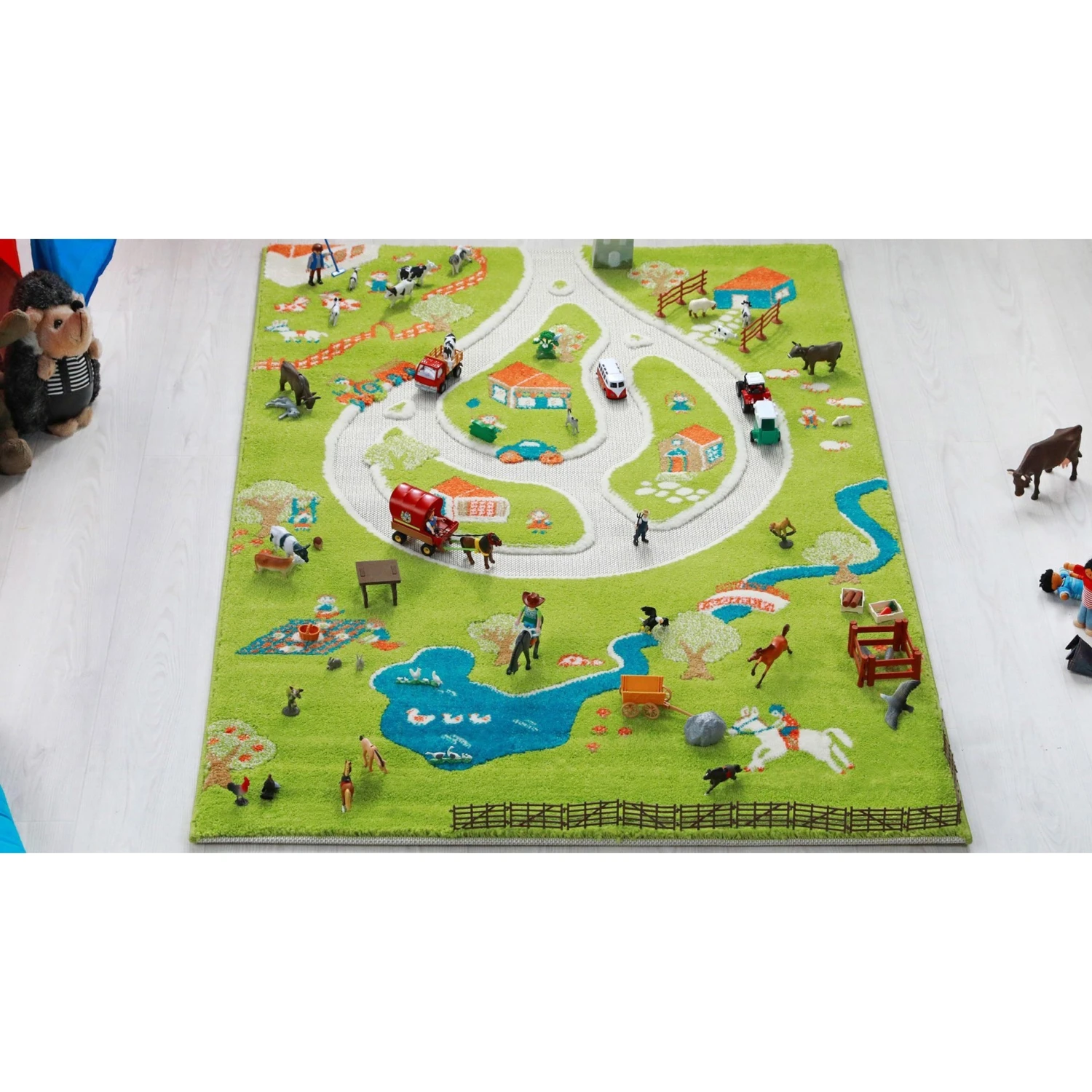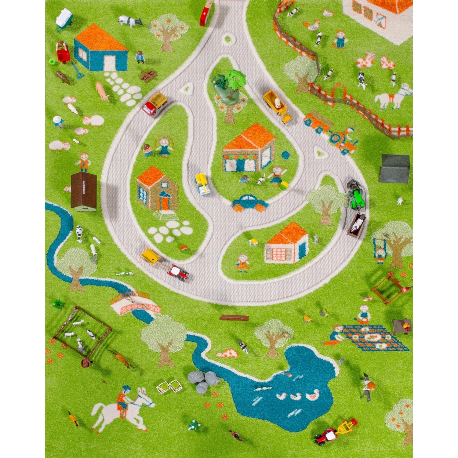 The Farm Rug features green pastures, a blue lake and more! The IVI rugs are designed to create hours of fun for kids. This rug is 3D and provides a large range of textures for your little one to play with their cars, farm animals, planes, boats and more!