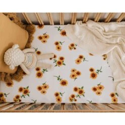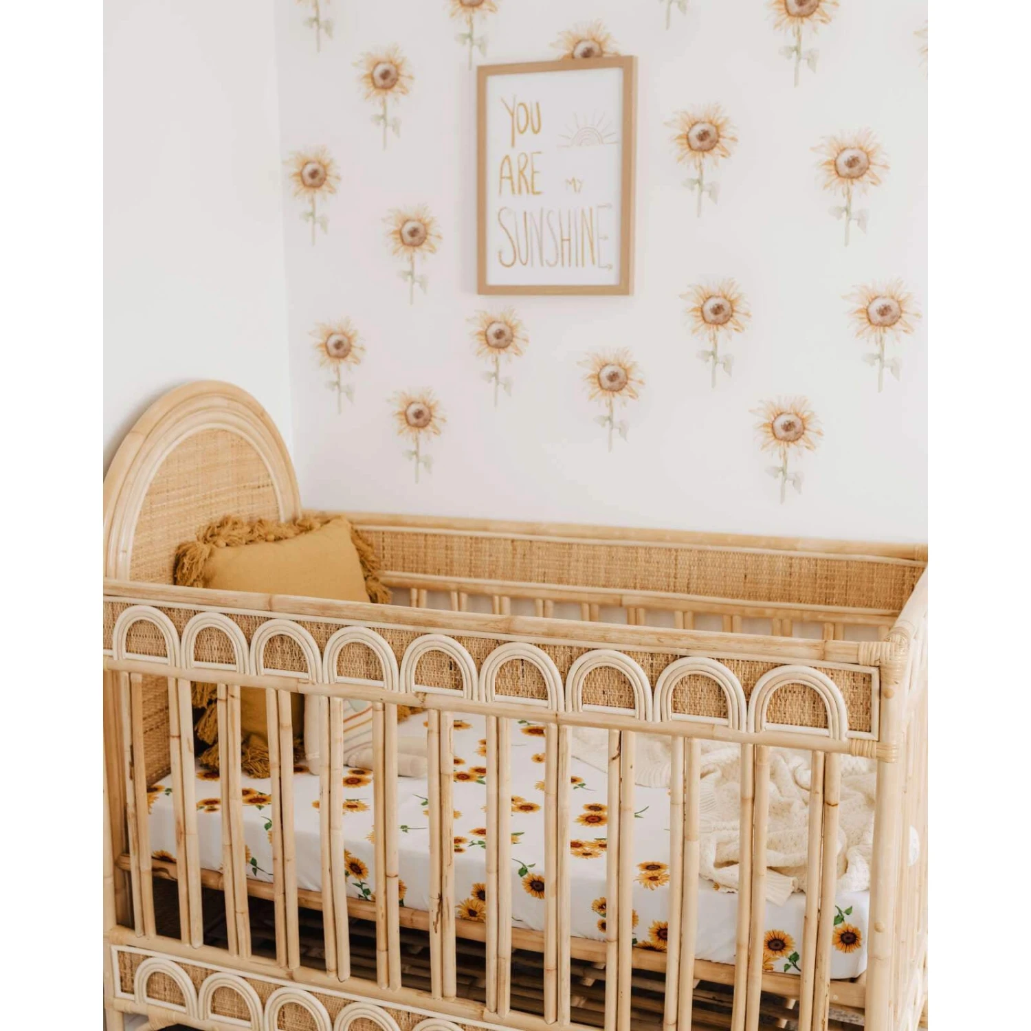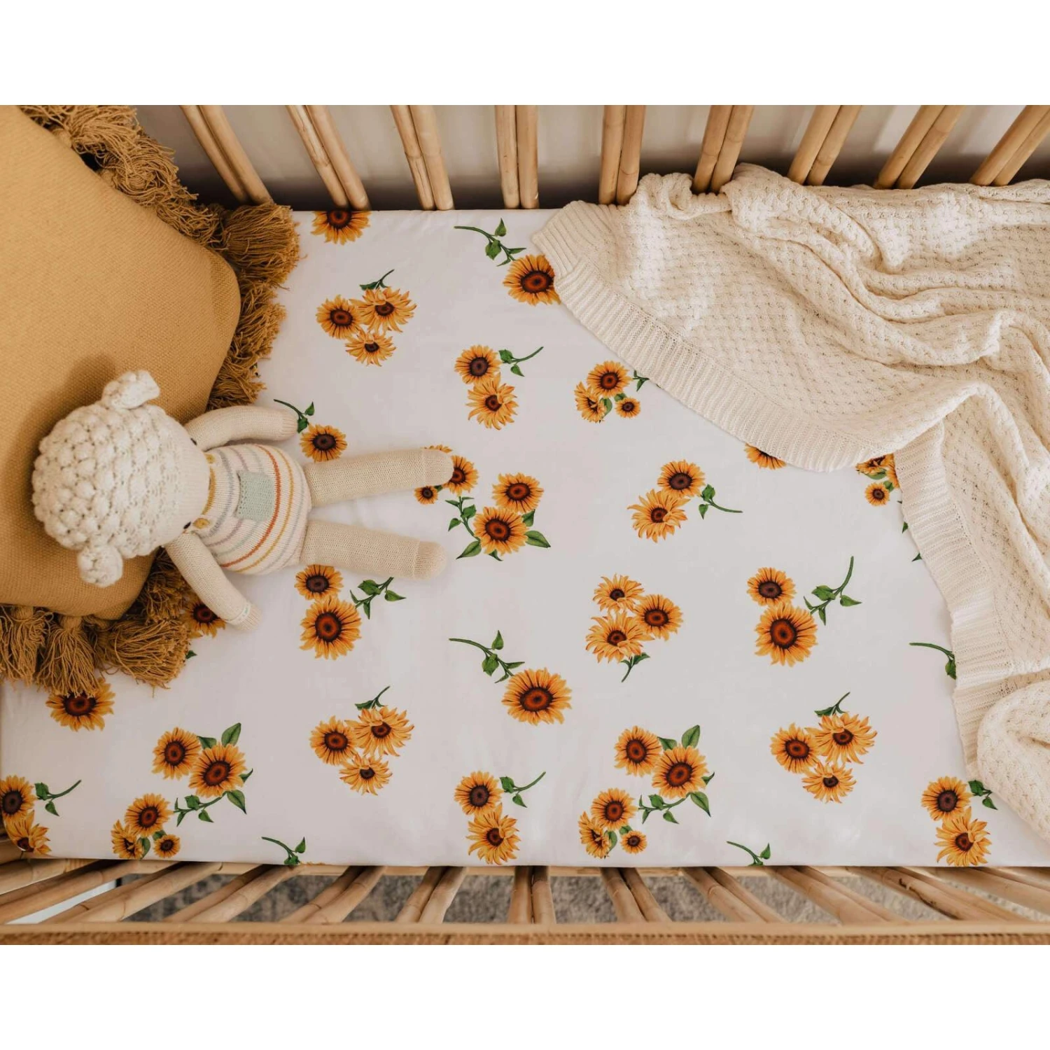 Our Sunflower Fitted Cot Sheet is made from snuggly soft stretch cotton jersey. Comes with a matching drawstring storage bag which can be used for other multi-purposes.