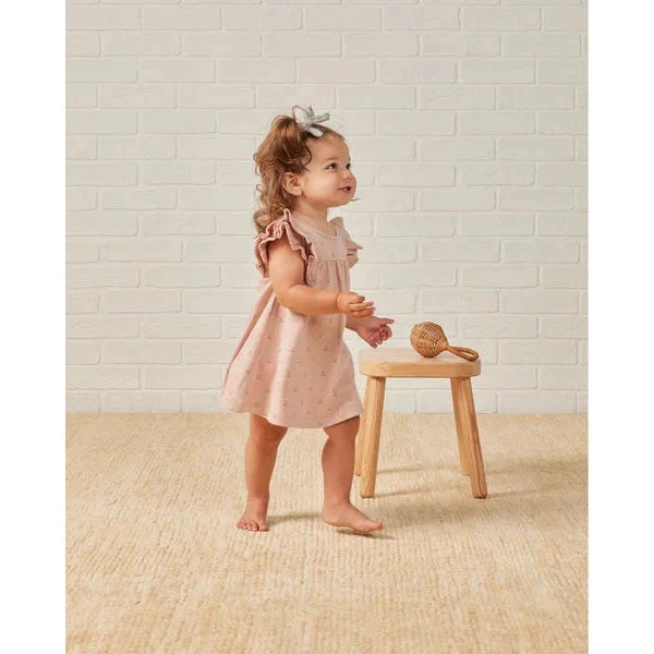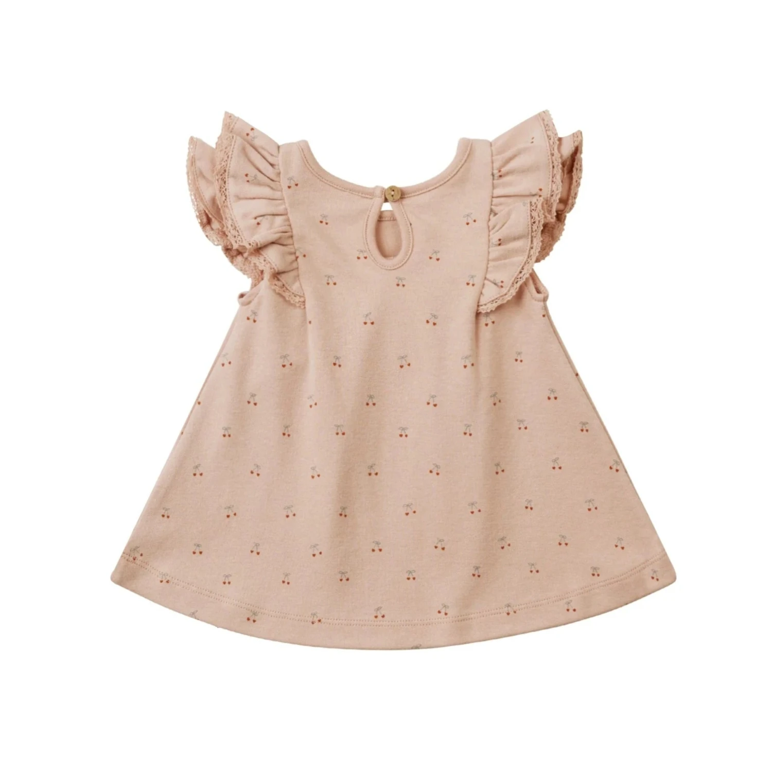 Velvety soft flutter sleeve dress with back summary closure. All sizes include coordinating bloomers.