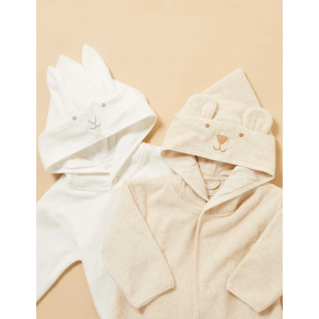 Our soft Hooded Bathrobe is perfect for layering over PJs or as a fun alternative for bath-time drying. Featuring an inbuilt hood with sweet animal embroidery and 3D ear details. Made from GOTS certified 100% Organic Cotton in an absorbent and soft double terry towelling.