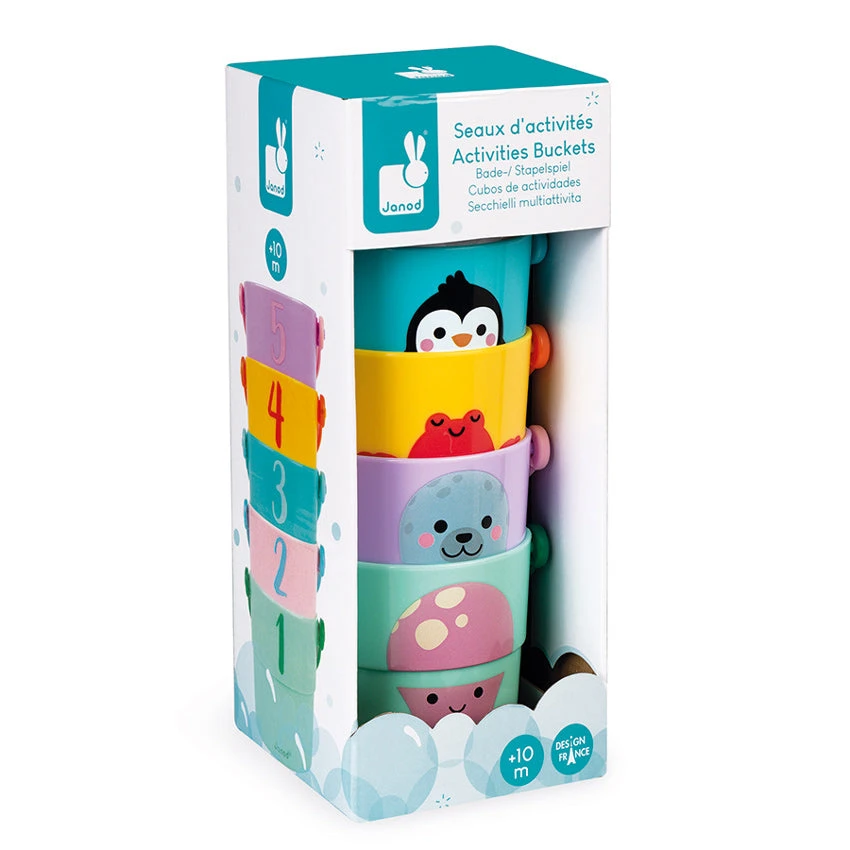 Encourage early concepts of first numbers and stacking with the 5 Activity Buckets from the Janod range of bath and water toys. Whether you use them inside or out, the buckets are numbered 1-5 to help children become familiar with numbers and 3 have different shaped holes in the bottom for varying rates of flow. Images of baby octopus, polar bear, penguin, lobster and seal are depicted on the opposite side to the numbers fostering colour and animal recognition. Stimulate development and curiosity with the 5 Activity Buckets from Janod.