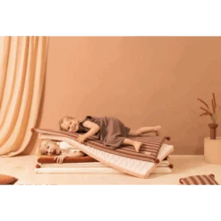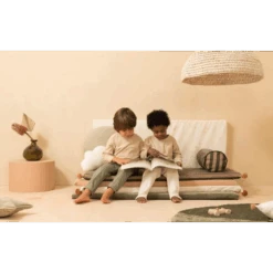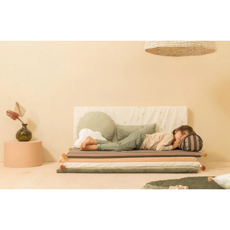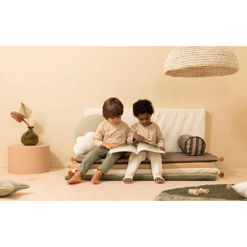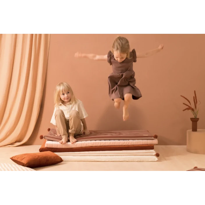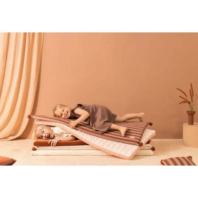 Nobodinoz iconic family of floor mat is growing with the Majestic floor mattress. With its felted stripes and 4 pompoms, it sets the tone for a contempory children’s decor that will give your interior warmth and a joyful atmosphere. Designed in the same dimensions as all Nobodinoz’s floor mattresses, the Majestic floor mattress will combines wonderfully with St Barth, Zanzibar or Monaco to create a reading corner or a playful and stylish playroom space. Organic cotton twill is a particularly resistant material that washes easily, making it the ideal fabric for decorative items for the little ones. We choose our fabrics to be in organic cotton, grown without pesticides, respectful of the environment as it preserves groundwater. In order to promote the circular economy, its padding is made entirely of recycled fibers from fabric scraps.
