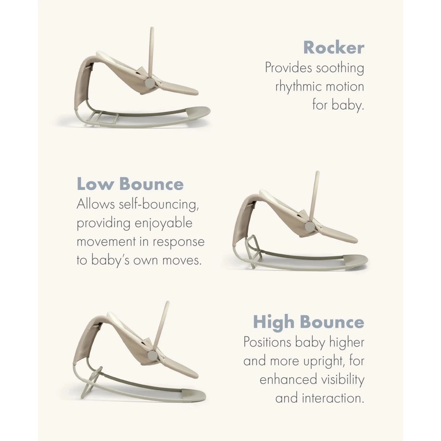 - The unique-shaped frame enhances rocking and bouncing for baby, while providing easy, comfortable interaction for parents