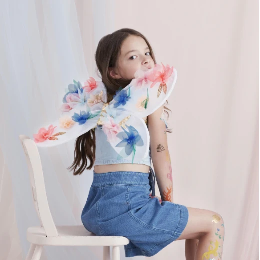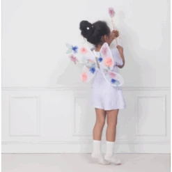 This beautiful wings and wand set is perfect for hours of imaginative play, or to wear to a special celebration. The wings are embellished with gorgeous organza flowers. The wand is a floral shape with ribbons , ideal for casting happy spells.
