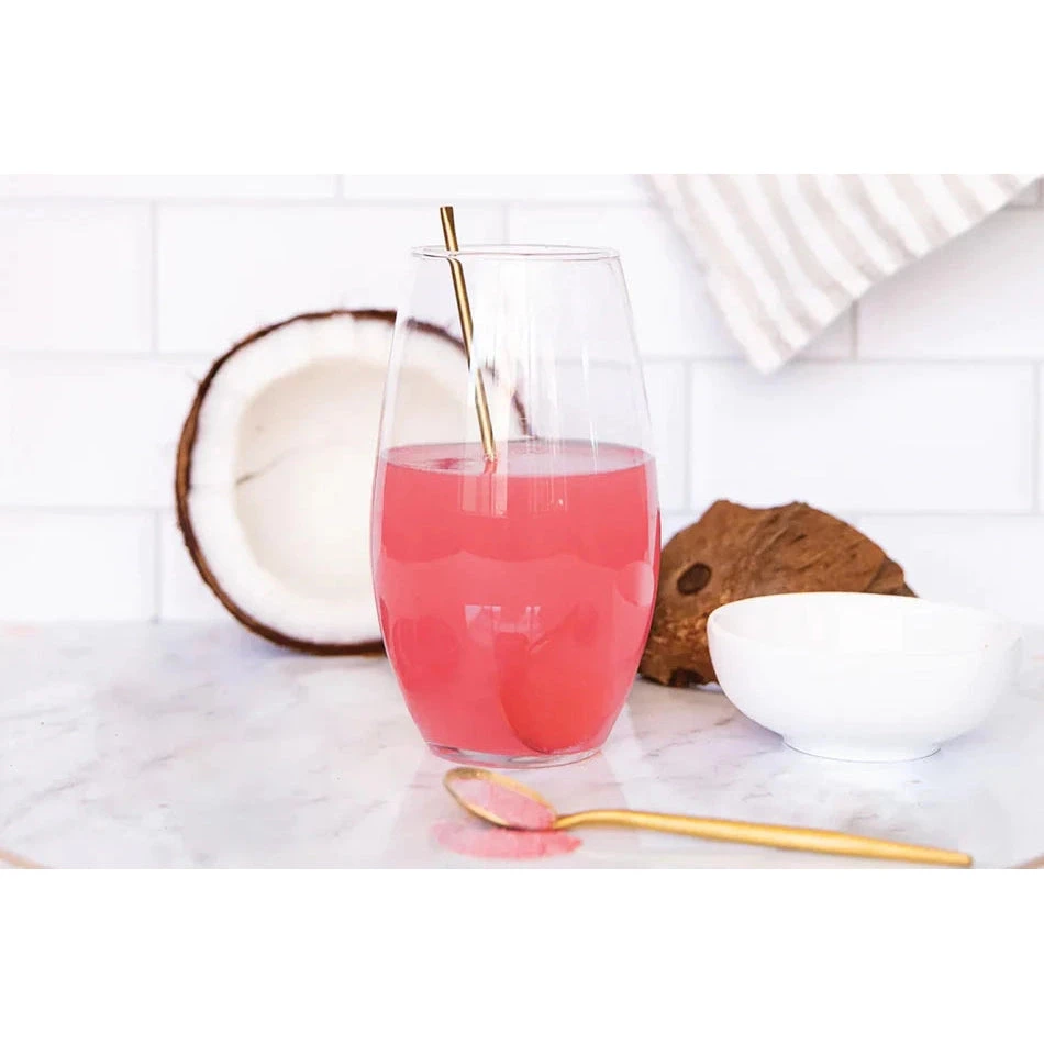 Coconut water powder 34% (coconut water concentrate, maltodextrin), red seaweed (Lithothamnion calcareum), berry juice powder 13% (tapioca maltodextrin, raspberry juice, strawberry juice, pomegranate juice, elderberry juice, blackcurrant juice, blueberry juice, cranberry juice, acai puree, goji juice), cranberry powder 8%, natural flavour, natural colour (beet red), acidity regulator (citric acid), ground ginger, acerola juice powder, natural sweetener (thaumatin)