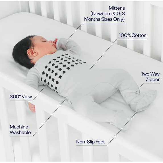The custom-designed pattern on all of our Breathing Wear works with the Pro Camera’s patented computer vision technology to safely detect your baby’s breathing motion in any sleep position–without any sensors, electronics, or radars!–and sends real-time alerts should your little one need you.