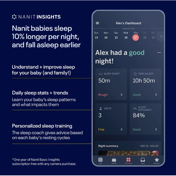 - Breathing motion monitoring: Nanit tracks your baby’s breathing motion without any electronics on them or in the cot.
