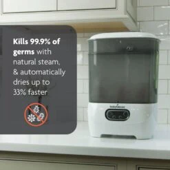 - Kills 99.9% of germs with natural steam, then automatically dries 33% faster. Items remain sterile inside for up to 24 hours