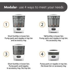 - Largest capacity of any sterilizer – holds 8 bottles, 2 full pump part sets and accessories from any brand