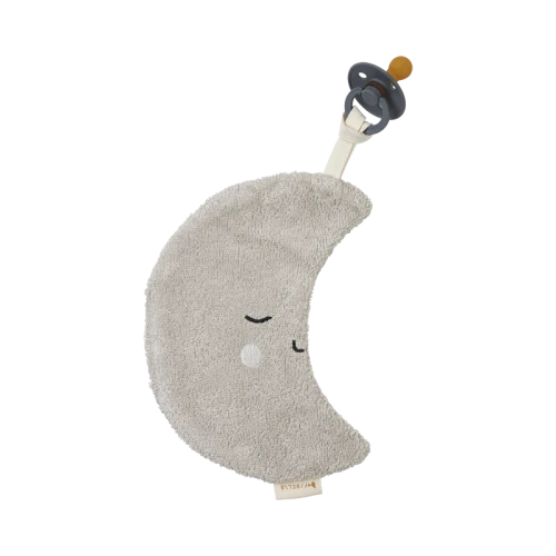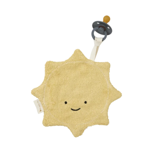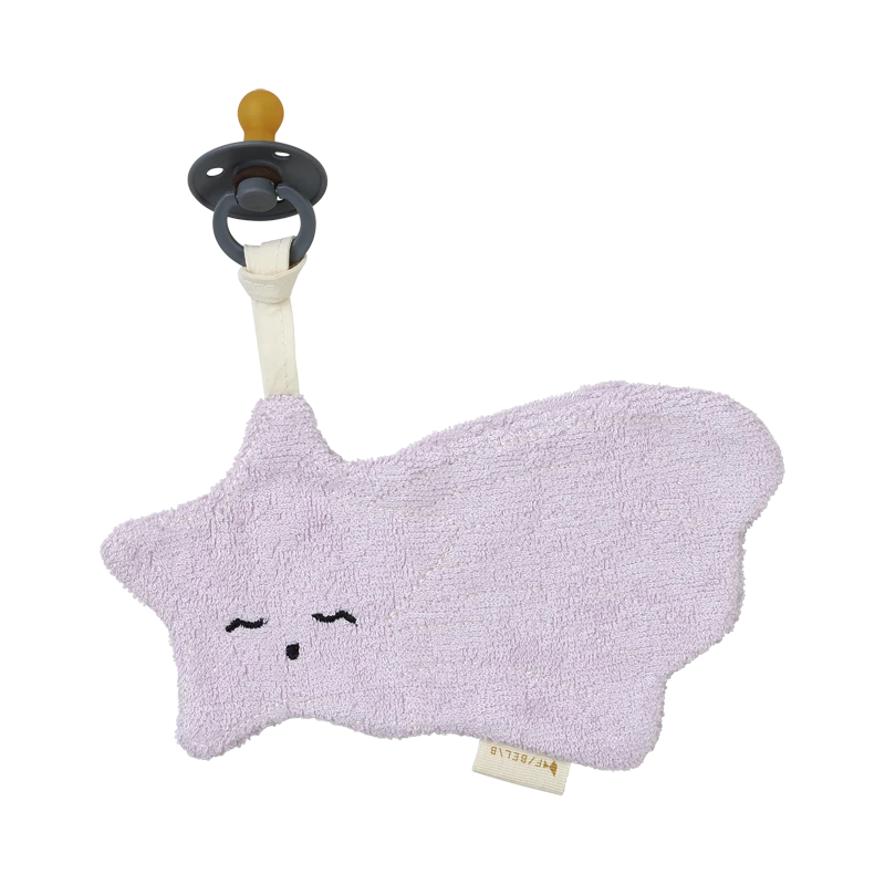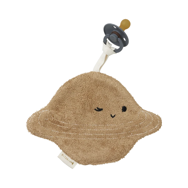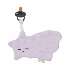 When needed, clip off the pacifier and let the baby play and cuddle made of a soft bambus cotton blend.
