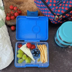 Yumbox’s Snack Bento box is a new, larger snack size 3-compartment bento box with a single leak-proof lid that allows you to pack fruit, nuts, crackers and wet foods (like yogurt, fruit puree – not drinks/water). It’s a great way to pack a healthy morning snack without the waste.