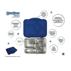 Yumbox Presto Stainless Steel Bento Box is designed for kids and adults. Featuring a more sustainable 5 compartment stainless steel tray and leak-proof plastic lid it lets you pack fruit, nuts, crackers and wet foods (like yogurt, fruit puree – not drinks/water). It’s a fantastic way to pack healthy meals for school, work and outings, using safe eco-friendly materials that are better for the planet.