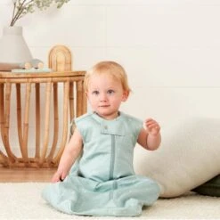 The 0.3 TOG Sheeting Sleeping Bag is perfect for keeping a child cool and comfortable in warm rooms 24°C / 75°F +. The TOG rating means that there is no need for additional blankets in the cot when using this product, making it a safe-sleep option. Parents can be rest assured that the breathable organic, natural fibres will help regulate their child’s temperature and prevent overheating. Parents can follow the FREE room thermometer and What to Wear guide provided with the product, to layer appropriately underneath to keep their child warm. We recommend pairing this pouch with one of our TOG-rated Layers or Bodywear underneath, and Arm Warmers can be added on top of the pouch for extra warmth (all sold separately).