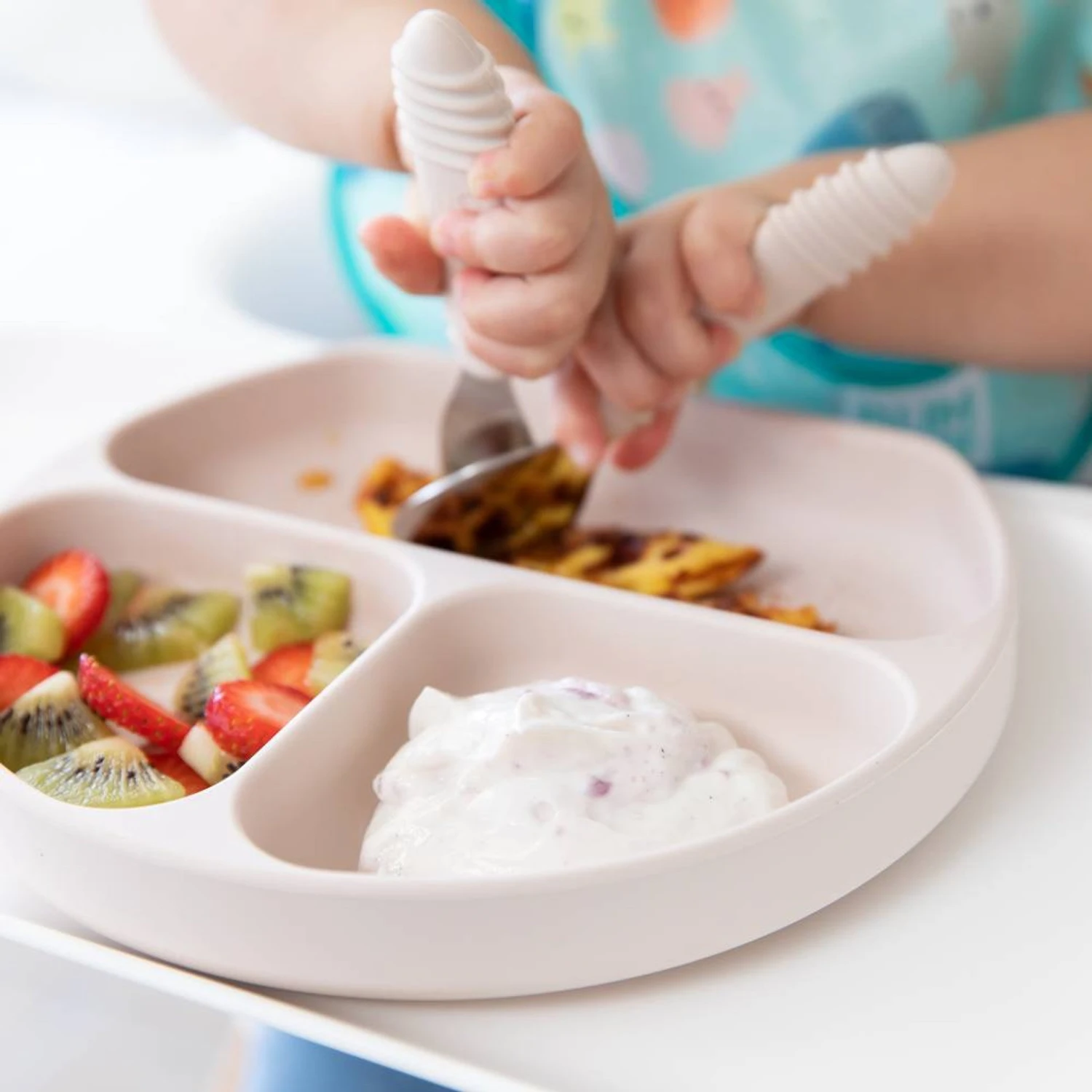 The Bumkins Silicone Grip Dish is perfect for little ones learning to self-feed. This divided plate is perfectly sized for toddler portions. A strong suction base ensures the dish stays put – even with the most aggressive toddler! Great for use on highchair trays or tables. A straight side allows kids to belly up to the plate, allowing less of a mess. Silicone can withstand low and high temperatures, easily transitioning from the refrigerator or freezer to the oven or microwave. Made with 100% food-safe silicone that’s durable, stain and bacteria resistant.