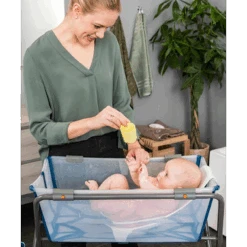 - A lightweight, portable baby bath tub that folds flat