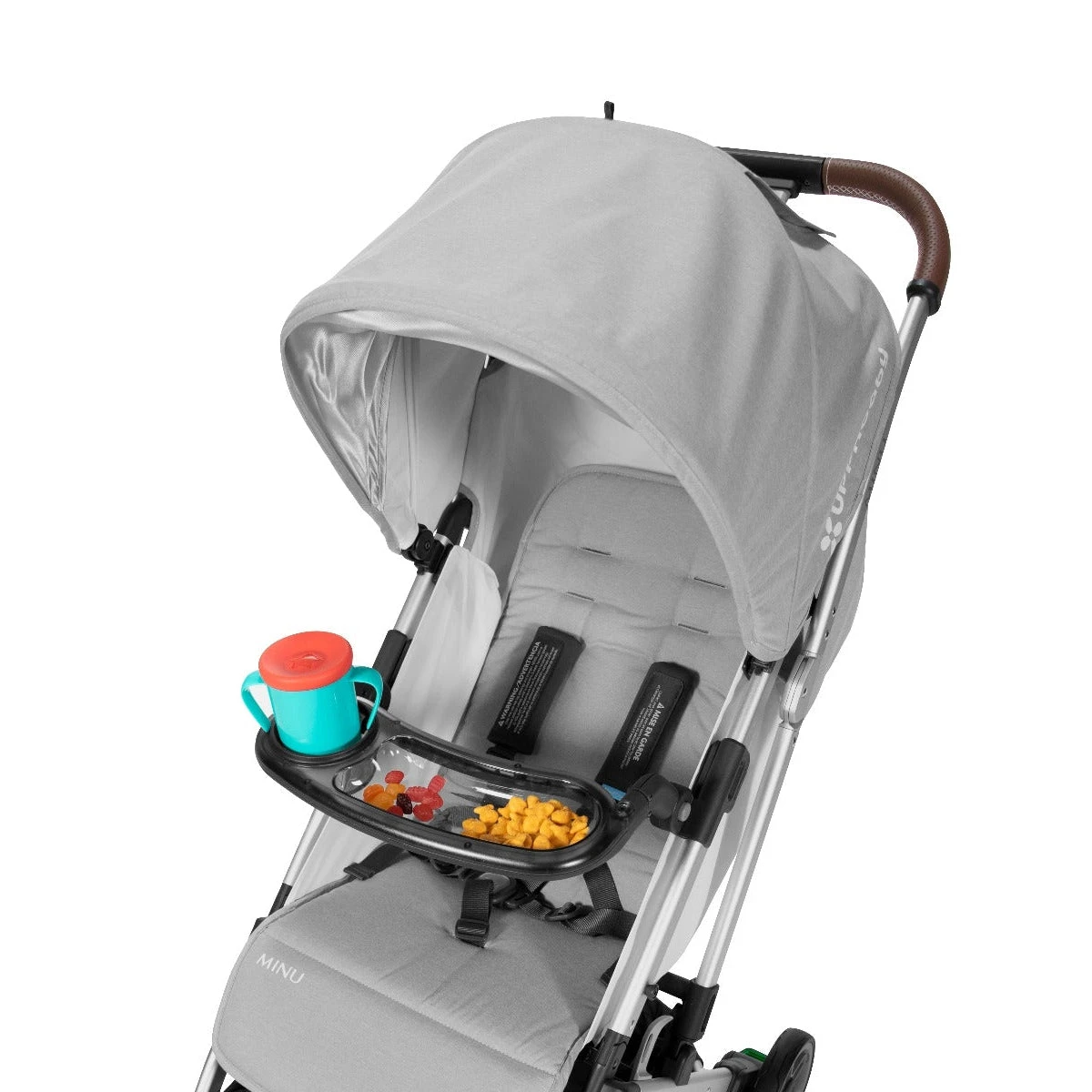 Keep your toddler satisfied while strolling with the perfect snacking surface and drink holder that attaches directly into the bumper bar housing of your stroller. The formed cup holder fits sippy cups and juice boxes of various sizes and the recessed bowl allows for easy scooping of snacks by little hands.